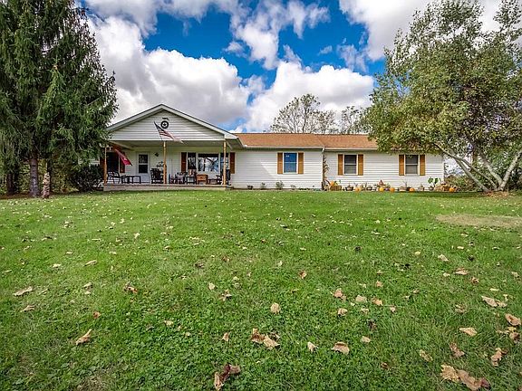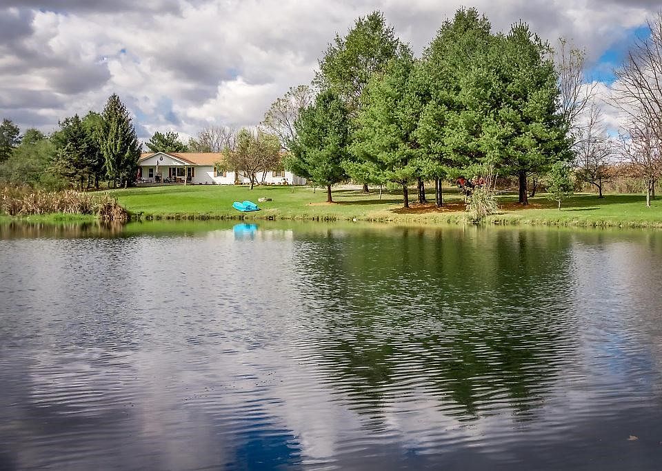 An oasis setting, just a quick jaunt from I-70/158, near Kirkersville! Big Front Porch! A wonderful 4+ acre property, with lots of trees, trails & large stocked pond! Enjoy paddle boating & fishing every day! Pond has been well cared for by this owner, with an Aqua Doc annual svc agmt, and contains Bass, Bluegill, Catfish & Grass carp. An easy-care ranch home is move-in ready with fresh neutral paint throughout, some newer flooring, bath updates, Trane furnace & heat pump and newer dimensional shingle roof. The owner's suite at one end and secondary bedrooms at the opposite side, provides a desirable floorplan and living space is fairly open as well. A huge basement is great space for media room, home gym or homeschooling & has a walkup to the garage. Century Link Highspeed w/Direct