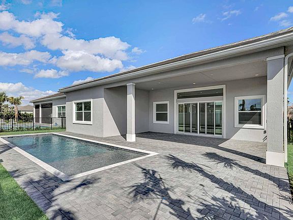 The stunning LEWISTON CONTEMPORARY home offers an expansive, open-concept floorplan perfect for modern living. A spacious, covered lanai extends your living space outdoors, creating an ideal setting for relaxation or entertaining by the private swimming pool. The chef-inspired kitchen boasts a large center island with a breakfast bar, abundant counter space, and ample cabinetry. The luxurious primary suite features dual walk-in closets and a spa-like bathroom with a dual-sink vanity, providing the perfect retreat. Plus, this exceptional home is just a short distance from The Pearl Clubhouse.Located within the prestigious Regency, a manned-gate, active adult (55+) community with exclusive 21,000 s.f. clubhouse.