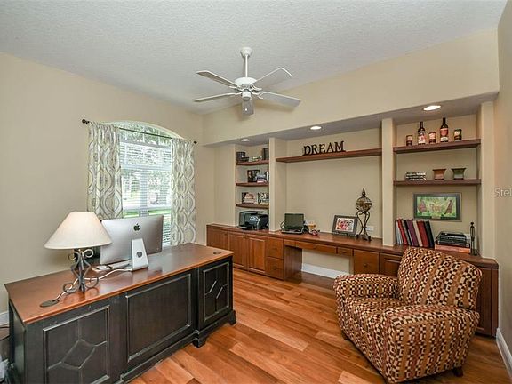 This spacious St. Augustine II model home built by Arthur Rutenberg is situated on a premium 3/4 acre lot, offers an open floor plan with 12' ceilings and includes 4 generous sized bedrooms, 3.5 baths, den, large bonus room, oversized 3 car garage and almost 3,700 square feet of living space. Special features include coffered ceilings, built-ins in den and family room, plantation shutters throughout, first-floor bonus room with large built-in window seat with storage, large back yard and extra parking spaces in the extended driveway. The owners can enjoy breathtaking views of the golf course and lush landscaped green space from the spacious lanai with heated pool and spa. improvements to the home include new roof in 2018, exterior and interior paint, new kitchen countertops and backsplash, upgraded floors in the living/dining and den, new tile in kitchen, family room and laundry, new fireplace tile surround, remodeled bathroom and more. The River Club community is known for its oversized homesites with amazing views of the Ron Garl designed 18-hole course perfect for both seasoned and beginner golfers. The community also offers a full-service pro shop, golf lessons, driving range, tennis courts, pool and lounge/banquet facilities. Located within the neighborhood is the Braden River Elementary and Middle School and you're a short drive from downtown Sarasota, University Town Center Mall and Dining, and the Gulf Coast Beaches.