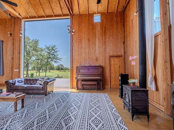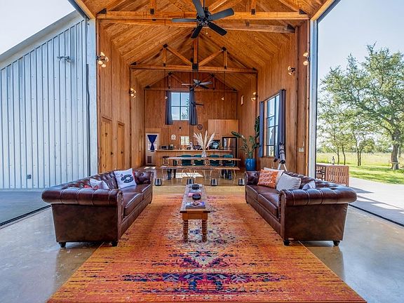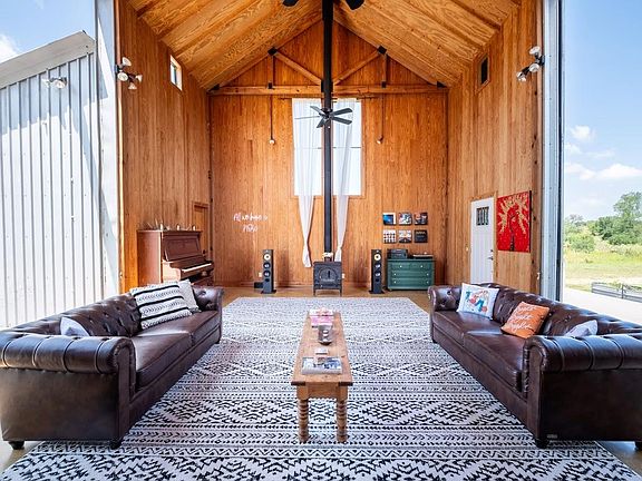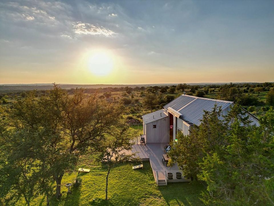 Discover the epitome of serene living at 997 Big Sandy, a rare unrestricted gem nestled in a prime location with endless possibilities. Whether you're seeking a residence, an event venue, a picturesque wedding destination, or a lucrative short-term rental investment, this property offers it all. The main structure, a striking silver barn, boasts a spacious 1,600-square-foot open living concept. Featuring two bedrooms and two full baths, the barn is designed with a large kitchen and dining area, soaring 24ft tall ceilings, and an authentic wood-burning stove fireplace. Enormous sliding barn doors open to reveal unrestricted views of the stunning Texas Hill Country. A large deck seamlessly transitions between indoor and outdoor living, offering breathtaking natural beauty, captivating wildlife, and great recreational opportunities. Here, you can witness amazing sunsets and indulge in stargazing. The second structure, a vibrant red building, spans 2,000 square feet under air conditioning. The open studio concept includes a kitchen and a bathroom, a large screened-in porch, and an attached flex space that can be utilized as a garage, gym, studio, or storage area. A 30 panel solar system on the roof covers your energy needs. Additional amenities include a custom built 16-ft long stand-alone sauna that includes a changing room, an indoor shower, outdoor shower, Huum wood-fired stove, and high fidelity Sonos sound system. Blink Smart Security cameras are available for peace of mind. The property is fully fenced, featuring a beautiful hand-stacked stone wall on the west side. Wildlife enthusiasts will appreciate the deer feeder, wild turkey feeder, and water trough that support abundant wildlife. The property also holds a Wildlife Management Tax Exemption. Enjoy private gated access and proximity to Johnson City, Fredericksburg, Horseshoe Bay, Austin, and San Antonio, making 997 Big Sandy the perfect blend of seclusion and convenience.