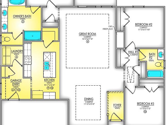 [] 1-story home featuring a The NEW Wisteria II Floor Plan, Foyer, Mud room off garage, large Great Room with Gas Fireplace and Tray Ceiling, Kitchen, Laundry Room, and a Formal Dining Room. Owners Suite boasts Tray ceilings and a walk-in closet, the bathroom has double sinks, garden tub and Tiled shower. Covered patio and 2-car garage. Fully sodded and irrigated lawns.