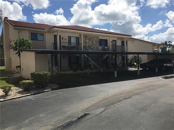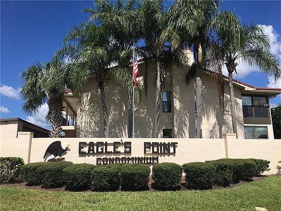 Charming ground level, end unit condo in Eagle's Point. This 2 bedroom, 2 bathroom unit boasts over 1300 square feet of living space. Home has a large, open, great room with a built in dry bar and a huge stone wood burning fireplace. Each bedroom features an entire wall of closet space to fill! Tinted glass windows surround the under roof sun room off the back of the living room. Kitchen has plenty of cabinet space and features a stackable washer/dryer in an indoor laundry closet. Covered carport has two spaces plus a guest space. Monthly fees include water, cable (Spectrum), ext maintenance (lawn/trees/bushes/roof/gutters/painting), community amenities, access to pool, pest control, sprinklers, AND flood insurance! 55+community is well kept and perfect for you to call home! A must see!