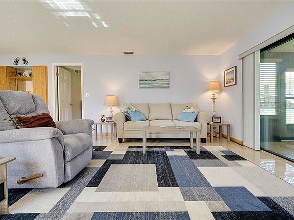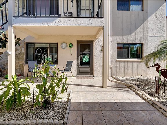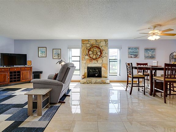 Features an open floor plan with plenty of natural light. The kitchen features newer oak cabinets, brand new stainless refrigerator and newer matching stove, microwave and dishwasher. Full-sized stackable washer & dryer included.The kitchen has a pass-thru overlooking the large dining and living room, both boasting gorgeous mirror-like marble-design floor tile. Small dry bar and wood burning fireplace for chilly mornings or quiet ambience. Enjoy the completely enclosed back lanai, with separate air conditioner and ceiling fan. A great space to relax with a good book, or entertain friends.The spacious master bedroom with large closet and ensuite bathroom gives you plenty of privacy. The generously sized guest bedroom is on the opposite side of the home for guests or family. Also features a guest bathroom which is across the hall a bath and linen closet.This home has all newer hurricane rated windows. Kitchen water filtration system, a gorgeous heated & cooled pool, club house for activities, & fitness room. Across the waterway is a protected wildlife preserve, a great spot to watch the nesting eagles, dolphins and manatees.. Fishing dock, boat mooring and kayak rack available.Home is being sold with living room, dining room and both bedroom furniture with exception of table lamps.