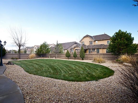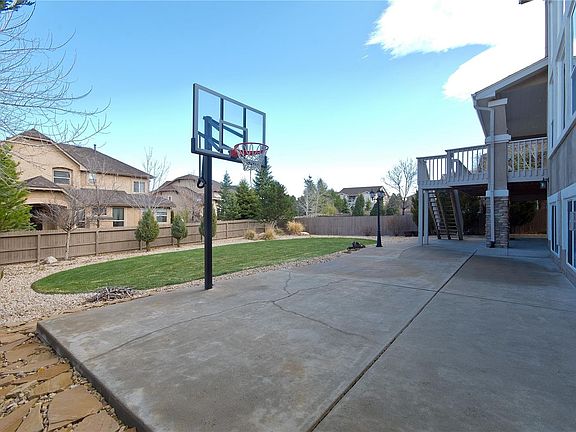 Fantastic home in highly desired Pine Creek community! Sitting on a 10,000+ sf lot, this property is professionally landscaped with large trees & bushes, raised planter, fenced yard with large grass area, 20x58 concrete pad included w/basketball court, covered composite deck with gas line for BBQ and large lower concrete patio for additional seating and enjoyment of the perfect Colorado summers! Low maintenance stucco and stone exterior! The home is desirable Vantage "Fairfax" model with curved stairway both up and down. You will love the floor plan of this home. Entering the home to 2-story entry with view of beautiful curved stairway. The heart of the home is truly special: A spacious great room with 2-story windows allowing for plenty of light, built-ins with gas fireplace, and open to eat-in dining and gourmet kitchen.