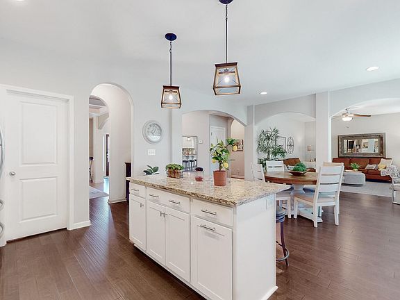 Don't miss this stunning corner-lot home, complete with a spacious three-car garage featuring an epoxy-coated floor. Step inside to an open-concept kitchen, perfect for entertaining, with a huge granite island, a corner walk-in pantry, and stainless steel appliances including a gas range. Enjoy casual dining in the breakfast area, which flows seamlessly to the inviting game day patio featuring an outdoor fireplace, Ideal for relaxing or hosting guests. Inside, unwind by the cozy fireplace in the great room, or retreat upstairs to the luxurious owner's suite. This private oasis offers a walk in closet, dual vanities, a tiled walk-in shower, and a garden tub for the ultimate in comfort. Additional highlights include hardwood flooring throughout, tile in wet areas, year round foliage landscaping with a wrought iron-fenced back yard with 2 access gates. This home has it all-schedule your tour today! Owner/Agent