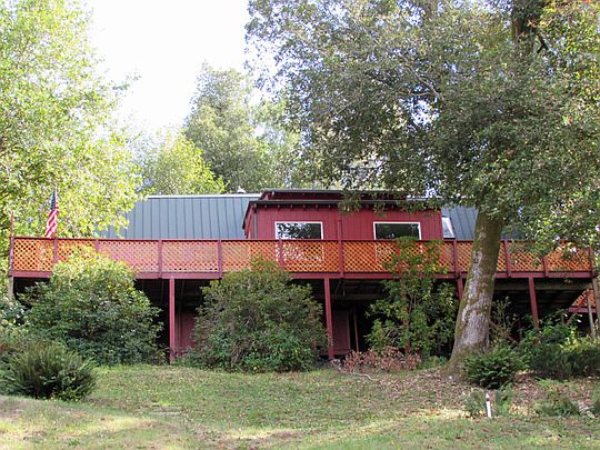 Riverfront cabin nestled in rhododendrons, hydrangeas and evergreens. Beautiful large deck overlooks the river and grounds. Home is charming and cozy with spiral staircase, sunny family room, freshly painted, new carpeting and flooring downstairs. There is access for boating, fishing and swimming, a large 2-car garage with storage and shop area, a delightful creek with waterfalls plus extra lot with shop/storage building and room to park boat, RV etc. Heavenly spot!