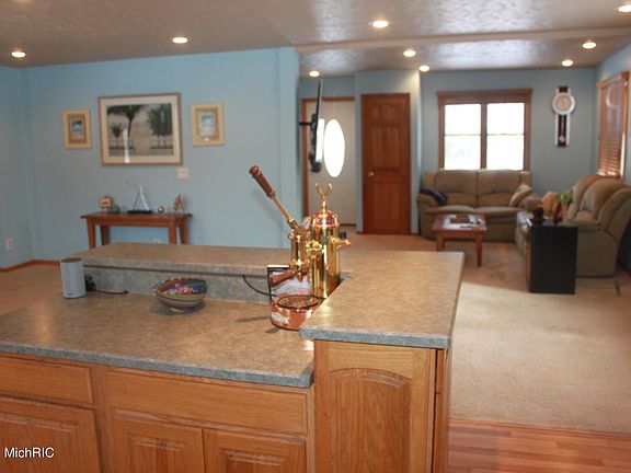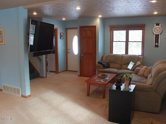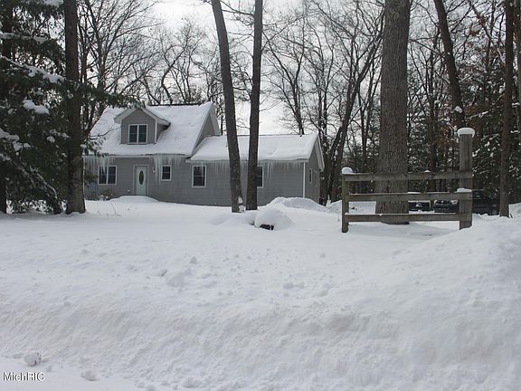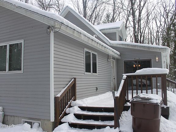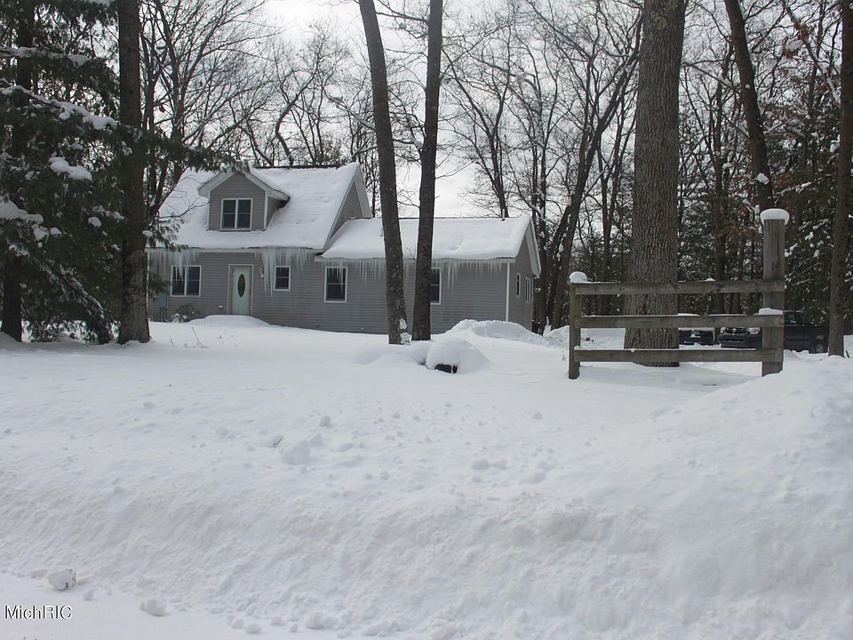 Well Maintained 3 bedroom 2 bath Chalet situated on a paved county road. Large Master Suite with full bath and walk in closet. Open living, dinning, kitchen area with sliders to back deck overlooking a meadow and all nature has to offer. 2 smaller bedrooms up with office landing and a partial unfinished basement for extra storage and laundry area. Great location in and around several area lakes one being Big Star and not far from the Pere Marquette.