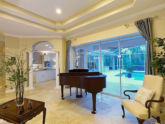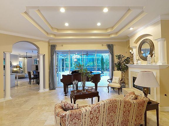Waterfront elegant custom built home situated on almost 3 acres backing up to Braden River with sweeping panoramic views of lake, woods and wildlife! A masterpiece of exquisite, timeless and detailed finishes are found throughout with recent updates and renovations including new roof in 2018 and hurricane impact windows and doors in 2020. This home has travertine stone floors, new zoned HVAC systems, high end Jenn-Air stainless steel appliances, upgraded crown molding and baseboard trim, newer pool pump and heater and much more. This home offers three bedrooms, den/bonus room, formal living, dining and family room. The gourmet kitchen boasts beautiful wood cabinetry, one level granite countertops, built-in oven, breakfast bar and direct access to the large family room with travertine stone floors and disappearing sliding glass doors to the lanai. Designed to create seamless indoor-outdoor living, the home features a spacious screened lanai with two covered entertaining areas featuring private heated pool, spa and summer kitchen while enjoying the uninterrupted water views. Further highlights include spacious master suite with luxurious bathroom, stately bonus room, living room with marble fireplace, three car, side load garage with brick flooring and newer garage doors, tray ceilings, upgraded light fixtures, extensive landscaping on all sides, outdoor accent lighting, backyard paver patio with small koi pond, double glass front entry doors, exterior paver walkway with columns and more. River Club is a golfing community with low HOA fees and NO CDD's!