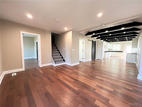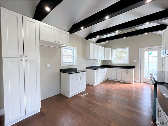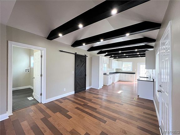 OPEN HOUSE CANCELLED. Prepare to be impressed upon entering this 1800's extensively renovated farmhouse situated on a 1.24 Acre Lot! Wow-factor kitchen with show-stopping cathedral beamed ceilings! All new kitchen cabinets, granite counters, sink, fixtures, etc. The bright kitchen is fully open to the dining area and large family room with new flooring throughout the first floor. First floor main bathroom is completely renovated with bath, tile surround, new flooring, and double vanity. Large bright primary bedroom on first floor also with completely new bathroom with tile flooring, large tiled shower and new sink/vanity. Two generous sized bedrooms on second level with all new carpeting. Enclosed porch to the side of the home. Two story barn/out-building/garage. Metal roof. Additional updates include all new electrical, new windows, furnace, drywall, plumbing, and more. This lovely house will make a wonderful home!