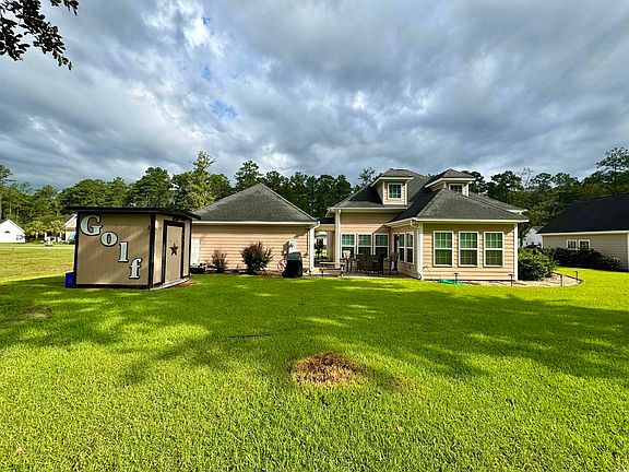 Beautiful home on the 14th tee box at Wedgefield. This house has a large porch across the front and an open floor plan inside. The primary suite is downstairs with an en suite bathroom. There is a smaller bedroom downstairs that could also serve as an office. The kitchen offers granite counter tops, stainless steel appliances and an island. Off the kitchen is a sunroom that can be used as extra living space, a dining room, or playroom for kids. Downstairs, there is also a half bath-great for guest! Upstairs, there are 2 bedrooms that share a bathroom. The house is connected to a climate controlled 2 bay garage. The driveway offers ample space for parking and has extra room for a boat or RV. Other features include gas connections, a drainage system in the yard, and a great patio overlooking the golf course! Just minutes to Front Street, Pawleys, and river access!