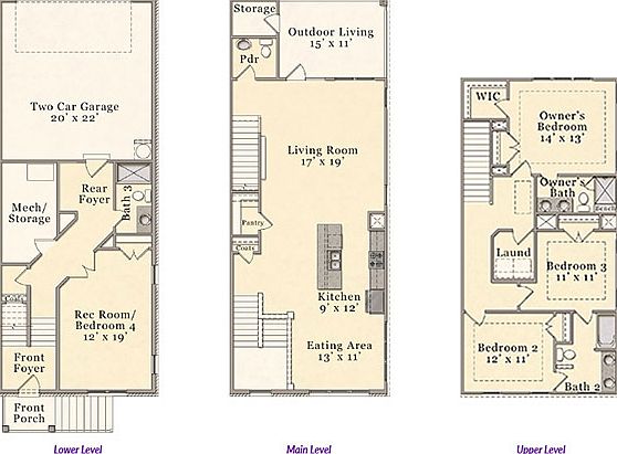 The Pullen, a 4 bed, 3.5 bath exterior townhome features an open floor plan design with plenty of light, versatile rooms and storage. The main level features a large living room, eating area, half-bath and beautiful kitchen with stainless steel sink and appliance package. Upgraded quartz countertops and kitchen island finish off this open kitchen. Combined with a large, covered outdoor living area with its own storage room and privacy wall, the Pullen is the perfect home for entertaining. [Pullen]