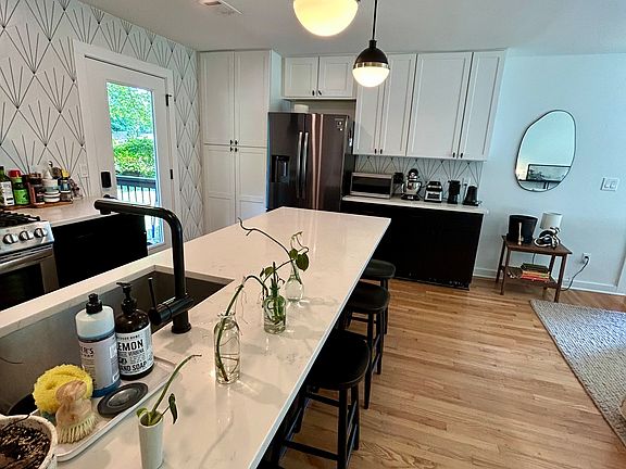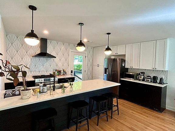The heart of the home is the stunning kitchen, featuring updated appliances, sleek quartz countertops, and a chic bar, ideal for both everyday meals and entertaining guests. The open living area is perfect for relaxing or hosting gatherings.