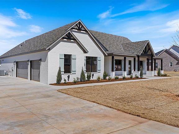 Farmhouse Dreaming. Sunset Seeing. Front Porch Sitting. Holiday Celebrating. Family Feeling...all wrapped up in one beautiful home. This true 4 Bed, 3.5 Bath w/study on .79 Acres in Deer Creek is sure to make your dreams come true. Situated outside city limits for country quiet, but close enough to enjoy everything the city has to offer. When entering you find herringbone patterned wood-look tile floors, tray entry w/stained shiplap, dandelion inspired chandelier & barn door to a tiled office. Continue into the vaulted & beamed living area w/wagon wheel chandelier, shiplap fireplace & large picture windows. Living area opens to kitchen & dining. Cooks appreciate the Z-line commercial range, stainless appliances, upgraded veined quartz countertops, large breakfast island, farmhouse sink, shiplap hood, open shelves, lots of cabinet storage & stylish zelige tile backsplash. Butlers pantry is sure to please w/designer deco tile floor, built-in cabinets & open pipe-bracket shelving. A relaxing master ensuite awaits complete w/private entry to the back porch, tray ceiling, separate double vanities, built-in linen cabinets, free-standing soaker tub, large shower & plenty of natural light. The huge walk-in closet connects to the laundry room making this one of our best-selling floor plans. Another popular feature is the mudroom area complete w/mudbench & half bath. Enjoy the split floor plan where all three additional bedrooms are on the opposite side of the house. Two bedrooms share a Jack & Jill bath w/double vanity. The fourth bedroom has its own private bath. Finally, get cozy on the large front porch or the giant vaulted back porch while enjoying the stunning Oklahoma Sunsets. With over 3/4 acre, there's plenty of room for a 30x40 shop, garden, pool, playground or whatever additional feature your family will enjoy. Ceiling fans in the bedrooms, security system, garage door lifts, 10 zones of lawn sprinklers, keypad front entry & gas stub for your grill always included.