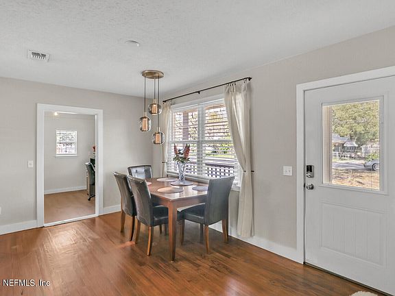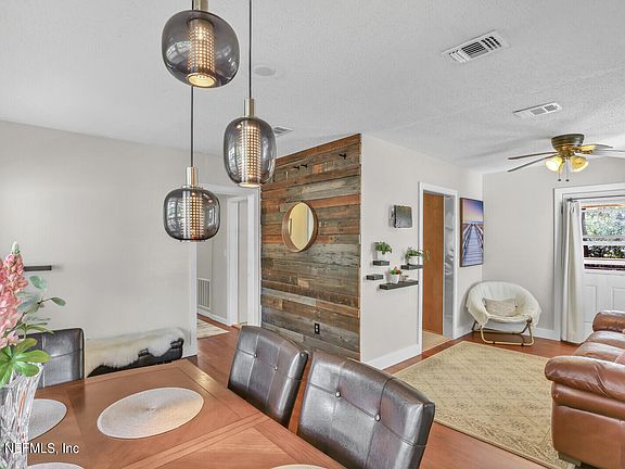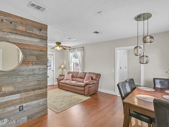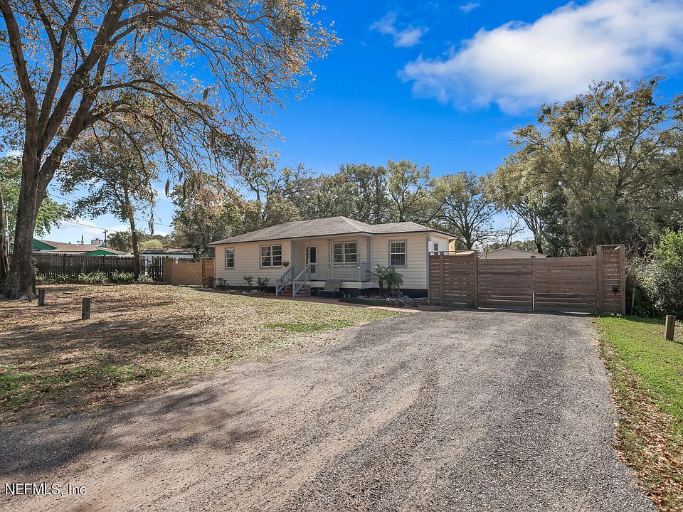 This 3 bed, 1 bath, 1,086 sq. ft. home has all the bells and whistles! For starters, there is no HOA! There is a nice front porch to relax and enjoy the weather. Enter inside to find quality hardwood floors, an open living and dining area, a perfect space for an office or a den, a dedicated laundry room, and a beautiful modernly updated bathroom in addition to the bedrooms. All of the mechanicals are in great shape with updated electrical and an AC and water heater that are no more than 3 years of age. Go out the rear door and find a back porch which is also perfect for hanging out and enjoying the outdoors. The property sits on a half acre lot. The massive back yard is fully fenced complete with an 8 foot privacy and security gate in the front! Not only that, find a spacious metal outdoor garage complete with a carport and electrical hookups that is suitable for the perfect workspace or storage area. There is also another large shed behind the garage! This home is super centrally located, only about 10 minutes from the St. Johns Town Center, 15 minutes from Downtown, and 20 minutes from the beaches! Do not miss out on this opportunity!