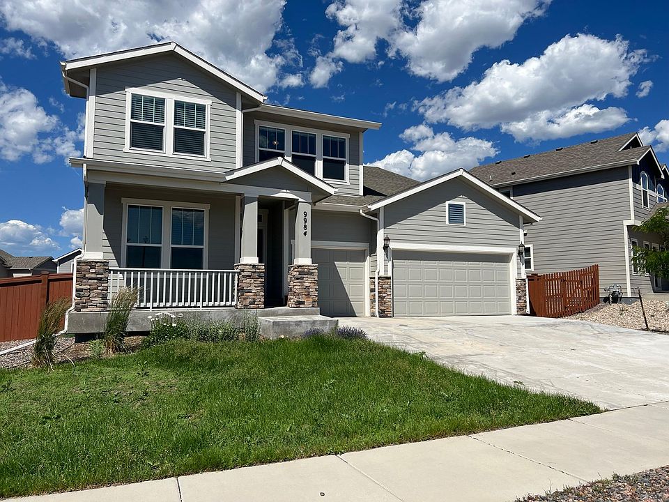Please call if interested in this property Monday-Friday during business hours 8AM-5PM Check out this open, single-family home with 3 bedrooms, 3 bathrooms in the popular Meridian Ranch. Beautiful wood laminate flooring greets you & draws you into an open-concept kitchen/floorplan & family room area with lots of natural light. The kitchen boasts stainless steel appliances, quartz countertops, a stylish subway tile backsplash, a spacious pantry, & a large island with plenty of room for additional seating. As if that's not enough, the kitchen is also outfitted with a wine refrigerator. A sliding glass door leads out to the cozy & enormous concrete patio where you can enjoy the amazing summer evenings. The home also boasts a raised garden box for a flower or vegetable garden. When you're ready to get out, the metro district also included access to the community center & neighborhood recreational facilities. Conveniently located near, parks, schools & shopping. Dogs negotiable, available NOW!! 12 month