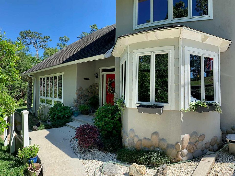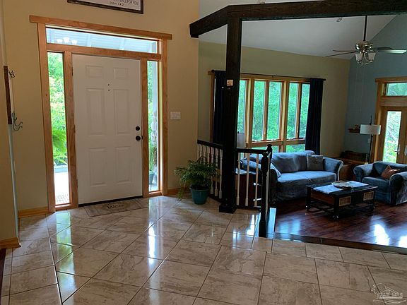 Immaculate Open Floor Plan with tons of Natural Lighting provided by Andersen "Classic" 400 Series Casement windows, which are both energy efficient and impact resistant. The whole house has vaulted ceilings, exposed structural wood beams, a 50-year roof, and constructed using Autoclaved Aerate Concrete block; which adds to the energy efficiency and also makes the main structure fire resistant. Beautiful front entry leading into the open foyer. Walk down a few stairs from the foyer into the living area which features 1-1/2" tongue and groove pine wrapping around the base of the room and double french doors that open to a small deck and overlooks the wooded area & stream. The current owners have cleaned and maintained little trails throughout the wooded area. The Master Bedroom is on the first floor, french door entry, open concept into the Master Bath with a HUGE jetted tub and large walk in shower with a glass block wall. Master closet has the W/D hookups for easy laundry access. From there you have a formal dining room that leads to the kitchen that has gorgeous windows overlooking the large, clean, private backyard, and has doors leading to the deck. Kitchen features black galaxy granite counter tops, a large pantry, and knotted pine cabinets. On the first floor is also a den area that has a lovely bay window facing the gravel driveway with a hide-away closet under the stairway. There is a two car garage with double garage doors. Leading up the stairs are the other 2 bedrooms. The loft area overlooks the living room and entryway and doubles as a fourth bedroom or office for extra space, if needed. The third bedroom doubles as an In-Law Suite and is currently used as an AirBNB space. This space features its own lit entryway with a lockbox, a full bathroom, and a kitchen, including a refrigerator with a stove top. Owners currently are bringing in about $450 a week for guests lodgeing. More upgrades and features to mention, an IMPECCABLE MUST SEE !!