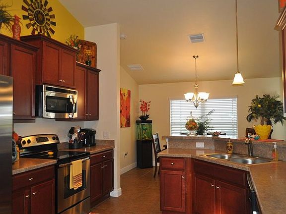 You don't want to miss this one! This unique home is the only ranch style on an oversized lot in the Creekside subdivision. Sunlight pours into this beautiful home with an open floor plan, giving you a warm welcome from the minute you walk in the door. You'll love cooking in this kitchen with its stainless appliances, large breakfast bar and sunrise views over the lake. The split bedroom plan is perfect for your family, plus one could be used as a den oroffice. The master suite has a luxurious bathroom with a walk-in closet, garden tub, separate shower, and dual sinks. Ceiling fans and light fixtures have been upgraded and the entire house has been painted withBehr washable paint. Meticulously kept landscaping, custom concrete curbing, gutters, and extended lanai.This home is one of a kind and impeccably kept by its original owner, make an appointment before it's gone!