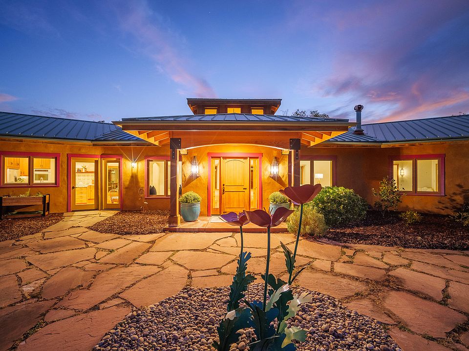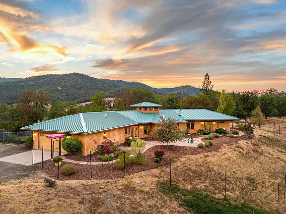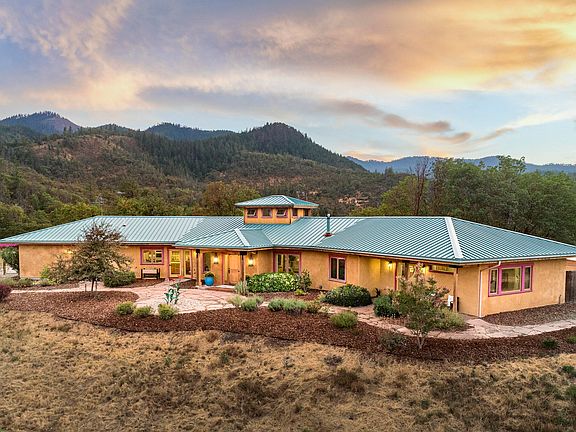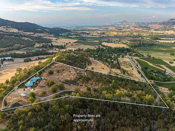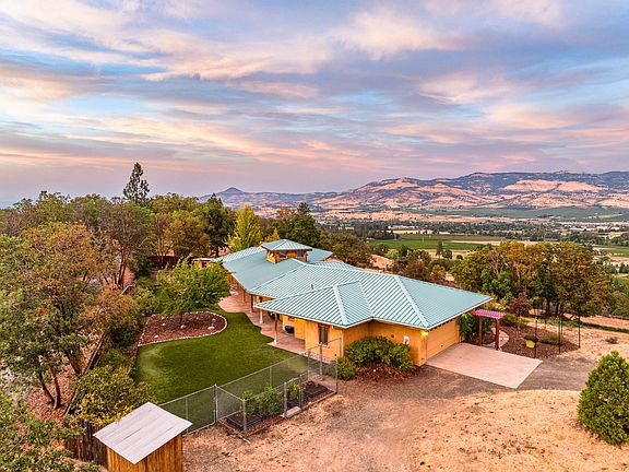 This hilltop villa blends luxury, energy efficiency, & convenience, all while offering panoramic views that create both a picturesque & private retreat. The 2009 built home features straw bale insulation, in-floor radiant heating, epoxied concrete floors, & passive solar design. Boasting a spacious 2,495 square foot floor plan, the home has inviting entertaining spaces w/vaulted ceilings, wood stove, & natural wood beams. The vibrant & artistic finishes add charm & character throughout. The northern wing features 3 bedrooms & 2 bathrooms, w/the spacious primary bedroom having great views, large walk-in closet, & en-suite bathroom. The southern wing features a large laundry room, guest half bathroom, office, & finished garage w/storage room. This 12 acre estate benefits from 10.20 acres of TID water rights, fenced garden, chicken coop, & more, & is situated in the sought-after Wagner Basin area, just outside of Talent & a short commute to the amenities of Ashland & Medford.