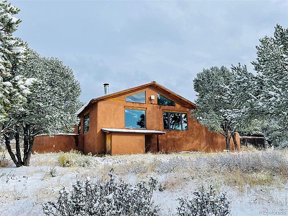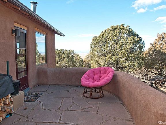Location, location, location! Large 2.48-acre parcel high in Chalet 1 of the Baca Grande, famous for breathtaking natural surroundings. Bright, custom, terra-cotta-colored 2BD/1.75BA home embodies southern Colorado living: Rocky Mtns, sweeping views, privacy, nature, wildlife, 285 days/yr of sunshine, & more. Backing to greenbelt, wooded 4-lot consolidation offers views & privacy, far from the hustle & bustle. 14,000-ft Sangre de Cristo peaks tower above. The vast San Luis Valley spreads out below. The San Juan Mtns (Continental Divide) stand 50+ miles to the west, along with Wolf Creek Ski Area, home to some of the deepest snow in the state (400"/yr). Inside, the home received several 2017 updates: stainless Kitchenaid appliances, dbl-slipper soak-tub, custom courtyard gates & fencing, washer/dryer, and extensive fire mitigation. Frame-built with straw bale insulation, the walls are thick and beautifully plastered. Enter via walled flagstone terrace. Behold the great room bathed in natural light, inviting you to take a load off and marvel at the view. Large windows, cozy wood stove, built-in banquettes, and stained concrete floors. Adjoining kitchen has attractive tile counters, custom cabinets, large island - 2 steps to the dining table, perfect for entertaining. Open-concept living allows easy movement, from lounging, to cooking, to dining, back to lounging. French doors lead to walled flagstone terrace, enjoy morning coffee or dining al fresco. Pinon and Juniper trees offer shade and privacy. Custom iron gate opens to driveway/parking. Primary bedroom looks into the forest, has walk-in closet, attached 1/2 bath on one side and double-slipper clawfoot tub on the other. Guest bedroom features bonus sleeping loft. 3/4 guest bath on the hallway, which also has laundry/utility room with LP water heaters (tank and tankless). Custom plaster walls with handsome wooden headers throughout. In floor heat. Metal roof & stucco exterior. Call now to schedule your showing!