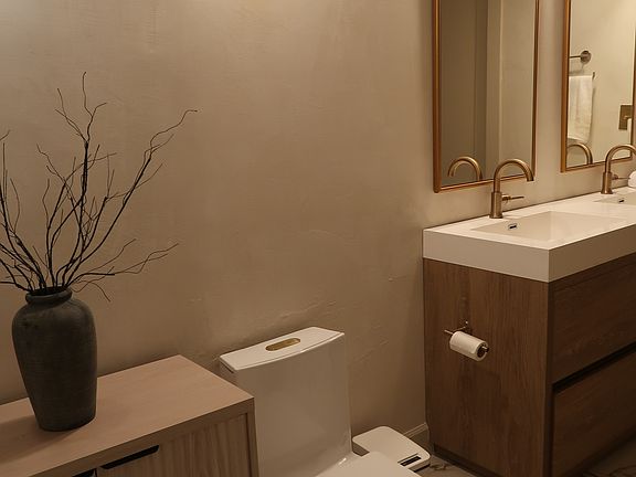 The interior features clean architectural lines, custom millwork, and abundant natural light throughout. The kitchen is equipped with brand-new appliances, a hidden refrigerator, and sleek marble finishes. The spacious primary suite includes a walk-in closet and ensuite bath with dual vanities and brushed gold fixtures.