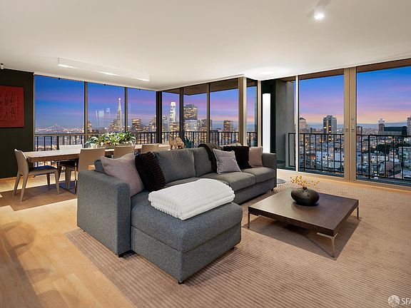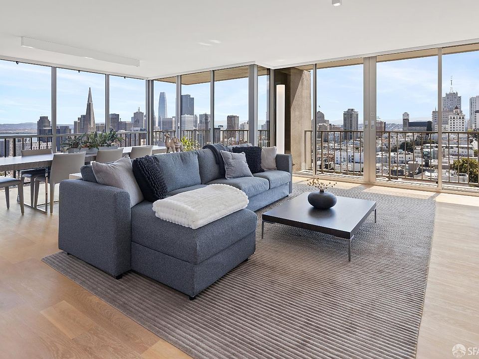 Positioned on the southeast corner of The Summit atop Russian Hill, this renovated residence offers sweeping views of the Bay Bridge, City Skyline, Sutro Tower, and downtown through floor-to-ceiling windows. Redesigned to a contemporary European standard, the home features white oak millwork, Basaltina stone flooring, and custom floating cabinetry. The open living and dining areas are wrapped in glass and open to a full-width terrace. A Crema Europa limestone feature wall and whitewashed oak paneling add warmth and texture. The kitchen is outfitted with high-gloss Poliform cabinetry, Chroma Quartz counters, island with induction cooktop, and appliances by Sub-Zero, Miele, and Bosch. The primary suite includes terrace access, a walk-in closet, and an en-suite bath with dual vanities and natural stone finishes. A second bedroom with terrace access and an adjacent full bath with Crema Marfil marble completes the layout. Radiant heat, automated shades and in-home laundry complete this home. Located at the peak of Russian Hill with sweeping views in all directions, 999 Green is a landmark hi-rise designed by modernist architect Joseph Eichler. Amenities include a 24-hour attended & ODADA-designed lobby, 1-car parking, storage, on-site management, and Resident's Outdoor Plaza.