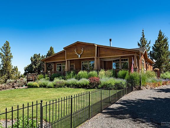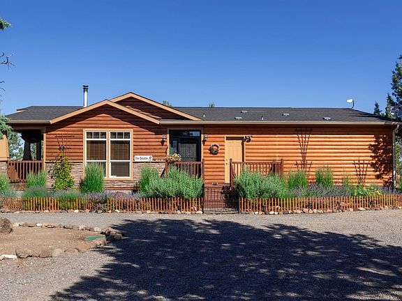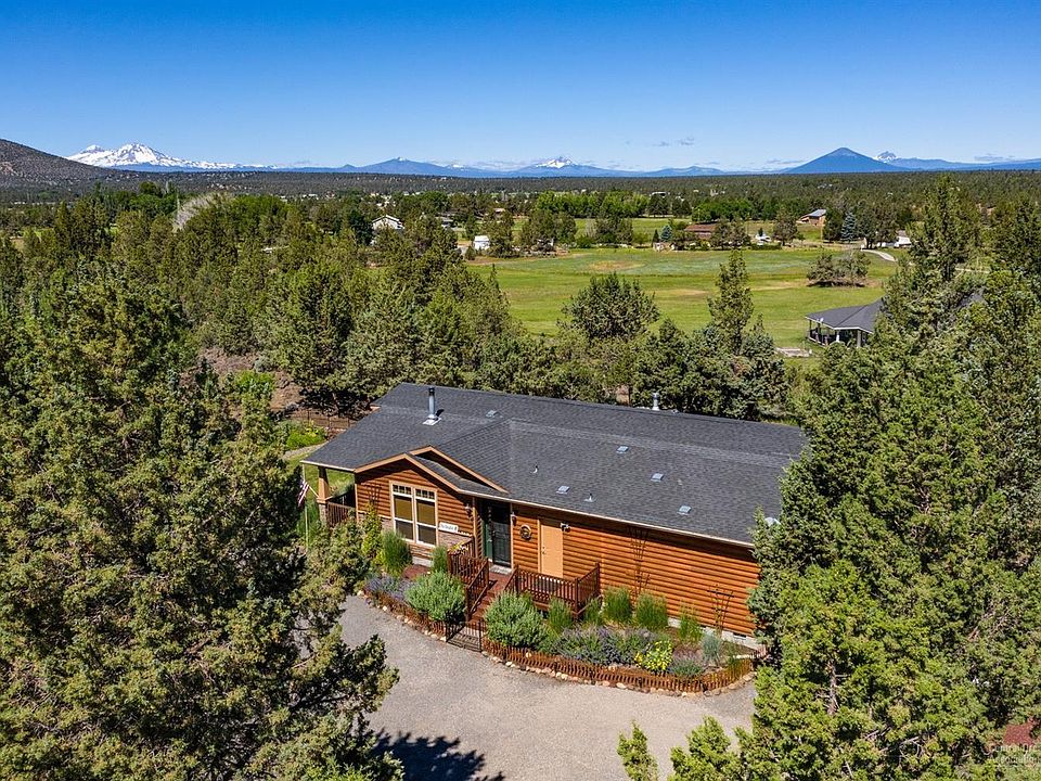 Enjoy the privacy 1/4 mile off the road, dead end street, on 5 acres located just minutes to Sisters and Eagle Crest. This is a lovely 3 bedroom 2 bathroom, over 2000 sf energy efficient, log style home with wrap around deck, large master with soaker tub and storage cabinetry and natural lighting everywhere! Chef's kitchen with granite counter tops, large island with 2 sinks, bar top plus breakfast nook, casual and formal living and Cascade Mountain views through picture windows. The property is set up for multiple use with large grassy area, landscaping, water feature, pasture, fencing, irrigation rights and pond, and RV hookups, 20x30 garage with shop, storage shed, root cellar, vegetable garden with raised beds, greenhouse, chicken coops and fire pit to enjoy those sunsets!