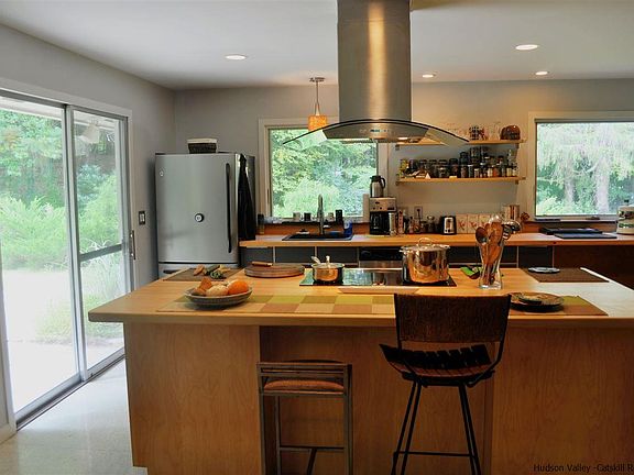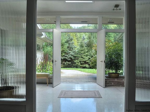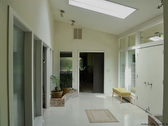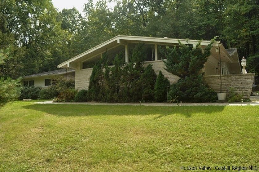 Authentic Mid Century Modern style home, private yet within 1/4 mile to the bus stop to NYC, and community center with swimming pool, tennis and basketball courts . Wonderful one level living for full timers or weekenders. Exceptionally built and designed for optimum use. Huge welcoming foyer with terrazzo flooring, lots of glass, skylights, built-in storage, murphy bed, marble wood burning fireplace, custom cabinets, center island, double sink, Frank Lloyd Wright design, recessed, luminesque lighting. Beautiful windows in kitchen, dining room and living room. So handsome by day and in the evening too with exterior lighting bringing natures canopy to life. Kitchen is contemporary in design, offering plenty of storage, butcher block counter tops. Perfect for entertaining with its open design and sliding glass doors for your guests to wander outside and enjoy the covered patio. Spare room perfect for in-laws, family room or home office. Attached garage suitable for studio space/workshop. Central air. A pleasure to show!