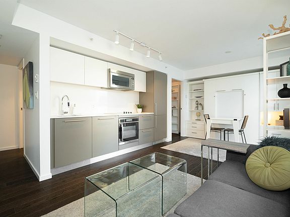 Calling all investors! Fully furnished and ready for income, or can come unfurnished and great first tie homebuyers! Welcome to 999 Seymour by award winning Townline, located in the heart of the city. This well thought out and efficient floor plan offers convenience with a built in wall bed, converting from bed to desk. Separate den for those who work from home or can be utilized as a bedroom or walk in closet. Loads of light with floor to ceiling windows. The European Kitchen boasts high-end integrated S/S appliances, quartz countertops, in suite laundry & ample storage. Enjoy the gym, yoga studio, clubhouse, lounge w/pool table, outdoor patio and bike locker. Pets and rentals allowed.