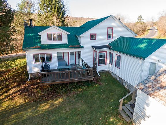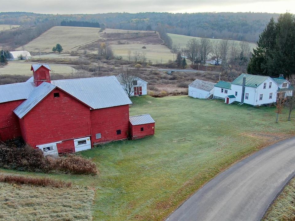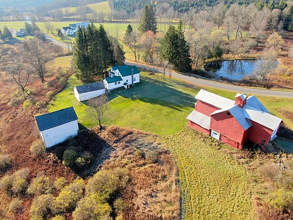 Idyllic country setting with this five bedroom farmhouse with multiple outbuildings on 93.75 beautiful acres. Acreage is mostly open with feilds and pastures, and also includes a separate 8.25 acre pine lot. Trails on large parcel lead to upper portion of property offering incredible views.The farmhouse has been partially renovated and has a nice curb appeal. The first floor features a large family room with woodstove, leading to formal dining area. Huge eat-in kitchen great for family gatherings. First floor rounded out by full bath and two bedrooms. Second floor has been updated to feature four bedroom spaces fully completed with tongue and groove accents on both walls and ceilings. A true family retreat. Main barn formerly used as a dairy barn needs some structural attention, currently used as storage. Two additional outbuildings to include a two story storage barn with the second floor set-up to included stain-glass windows and open area ideally suited for storage. Large equipment barn connected to rear of house. Large private deck for enjoying your surroundings or entertaining. Quiet country road with awesome acreage and approximate 1/3 acre pond.1,220 feet of frontage on Shapley Rd and 2,200' on Hoffman Road.