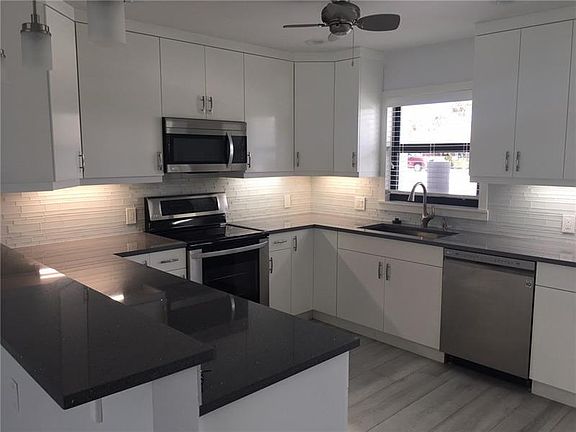 Rent this beautifully renovated modern home with all new everything. New Roof, New kitchen and baths, stainless steel, quartz tops, new tile floors, new cabinets. new impact glass windows and doors. Private fenced yard includes lawn service in rent. Home has 3 bedrooms, 2.5 renovated baths, master suite overlooking large back yard. Living room overlooks screened patio and yard. Parking is limited to two spaces. Roof will be replaced, going for permits now.