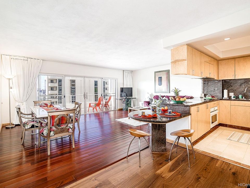 Bright and Breezy, this tastefully renovated apartment offers open concept living, kitchen and dining plus a huge lanai. Enjoy cooking your favorite meals with a direct view of Diamond Head, ocean and city skyline. Rich hardwood flooring enhance quality maple cabinetry and marble in kitchen and bathrooms. With over 1500 sf, this stylish Residential apartment with only 82 units, is move in ready and furnished. Two full size parking + 20 guest stalls, storage & 24/7 security all within easy access to downtown, beaches, restaurants & hospitals. Welcome Home!