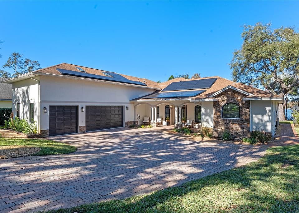 Welcome to your lake house! 9993 Lake Georgia Drive sits on a pristine 1.88-acre lot with 100 feet of private waterfront and the ease of no HOA. Upon arrival, enjoy a scenic drive through the beautiful grounds which had a major transformation in late 2022. The driveway leads you to the spectacular home with a three-car garage, complemented by ample parking for all your vehicles and guests. The side-facing garage conveniently has access from the front and rear allowing you to swiftly store and relocate your automotive or water vehicles and making it an ideal workspace. As you approach the front entrance to the home, you are immediately greeted by a bright and open space that overlooks the mesmerizing panoramic lake views. The inviting floor plan seamlessly blends elegance with functionality, ideal for hosting friends and family. The first floor of the home offers formal dining and living spaces, a sophisticated kitchen with top-tier appliances, Blue Bahia granite, a large island, walk-in pantry and breakfast nook. A family room with views of the outdoors and a cozy fireplace help complete the common areas on this floor. Two generously sized bedrooms share a bathroom, a third bedroom is ideally suited for an office, and an oversized private owner’s retreat completes this level. A hallway leading to the garage offers a conveniently located laundry room. Upstairs you will find a private en suite with breathtaking views, ideal as a guest room, in-law suite, or teenagers retreat. There is also an oversized bonus/flex space and easy walk-in access to the attic space storage. Stepping outside, a sprawling covered patio entices you to sit and enjoy the breezes off of Lake Georgia, frolic in the heated saltwater pool, or enjoy a fabulous barbecue under the built-in gazebo. Beyond your beautiful backyard that offers ample green space to play sports on the artificial turf, walk down to the shore to dip your toes in the lake or explore Lake Georgia from your private launch or from your dock complete with boat house and lift (recently upgraded with handrails and fresh paint). This home can easily be your forever home. Other features and upgrades include a brand-new roof (2019), new refrigerator, washer and dryer (2021), new pool screen (2018), new water heater (2021), new garage door motors (2021). Improvements completed in the past two years include: two brand new AC units with UV lights, new dishwasher and microwave, pool pump and salt cell, new Renewal by Anderson windows, sliding and French doors, a Tesla solar system, charger and power wall (will be paid off by sellers at closing) leaving you with the convenience of energy efficiency. New electric panel with additional hookups and variable voltage, fresh insulation in the attic, exterior home and dock paint, newly built pergola, light fixtures and ceiling fans, faucets in kitchen and baths, water RO system, refinished kitchen and baths, and replacement of all carpet with tile flooring. Lake Georgia is a private lake covering 83 acres offering fishing, swimming, boating, and skiing. There is no public access or ramps to the lake making it truly private, you only share the lake with the neighbors. This home provides you the unique opportunity to escape the hustle and bustle of the city while still being less than 20 minutes from Winter Park, less than 10 minutes from UCF, 30 minutes from Disney, under 20 minutes to downtown Orlando, and under 20 minutes to MCO.
