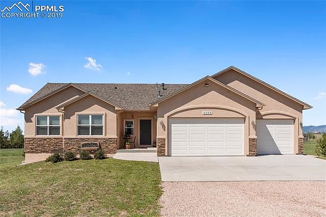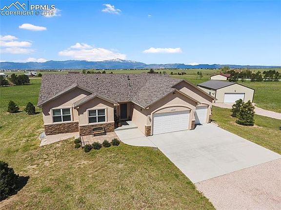 Immaculate custom built home on a 5 acre lot with sweeping front range views! Walk-in to the beautiful hand scraped acacia wood floors that extend throughout the great room, dining area, and kitchen. The Great room has vaulted ceilings, a Heat and Glo fireplace, and walks out to the covered back deck. The gourmet kitchen features 42" maple cabinets, double ovens with one of them a convection oven, gas cooktop, solid surface countertops and quartz on the large island, counter seating, mortion sensor faucet and pantry. The adjoining dining area also walks out to the back deck. The home has a large master bedroom with Pikes Peak views, second fireplace and attached five piece bath with a deep soaking tub and walk-in closet. Two additional spacious bedrooms, a second full bath and laundry space complete the main level. The finished garden level basement has 9' ceilings, a HUGE family room with a game area as well as a third fireplace. Also on the lower level is a fourth bedroom with a walk-in closet, third full bath and a storage area. The home has an oversized attached three car garage with over 700 sq. ft, 8' doors, fully insulated, dry walled, and painted, as well as a 30' X 40' outbuilding that has an 8' door, 100 amp service, insulation wrap and tons of lighting. Other amenities include air conditioning, 95% Trane furnace and humidifier, wrought iron railings in the home, a whole house water filter system, new roof, acrylic stucco, and every attention to detail. The covered back deck provides a relaxing place to drink coffee in the mornings or watch those beautiful Colorado sunsets. The lot is fully fenced, incredibly maintained and a convenient location that feels like country living but takes just minutes to everything that you could need!