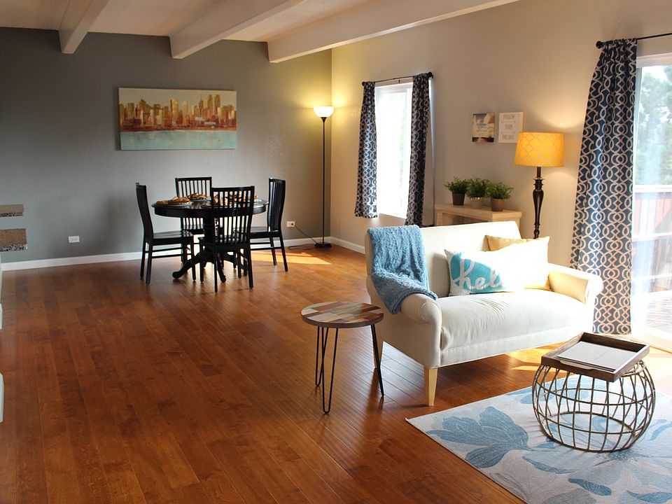 A beautiful condominium retreat. 1138 sq-ft upper level, 2 bedroom, 2 bath unit with no shared walls. Completely redone. - Spacious living room and dining room. (27' x 13') Remodeled fireplace with stone surround. - New kitchen with all new stainless steel appliances: stove/oven, refrigerator, dishwasher, hood. Oak cabinets, modern backsplash, and granite countertops. Recessed lighting and pendant lights. - Bathrooms are beautifully appointed with spa-like qualities. Tile throughout. New vanities and sinks. New fixtures. - Master Bedroom (17' x 12') is a retreat within a retreat. Large walk-in closet and private spa-like bathroom. Tile throughout with new vanity, mirrors,and fixtures. - Guest Bedroom (13.5' x 10') also has walk-in closet. - Guest Bathroom has tile throughout and has new vanity, mirror and fixtures. - Stacked washer and dryer. - New engineered hardwood throughout. - New windows and sliding glass door. - Freshly painted. - Private 14' x 18' deck and 6' x 6' balcony. - Unit face southwest so it has plenty of natural light and great views from second story. - One reserved covered parking space. - Building includes a shared laundry room. - Condominium complex has a swimming pool. - Lots of green space and pet friendly. - HOA ($480/mo) includes heat/cooling, electricity, water, garbage, and outside maintenance. - Condominium complex is right on Parker Rd, Iliff, and Havana triangle providing over 30 dining options in 1 mile radius. - 2 mile2 from I-225 and 15 minutes from downtown Denver.