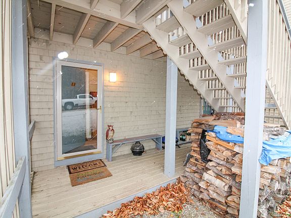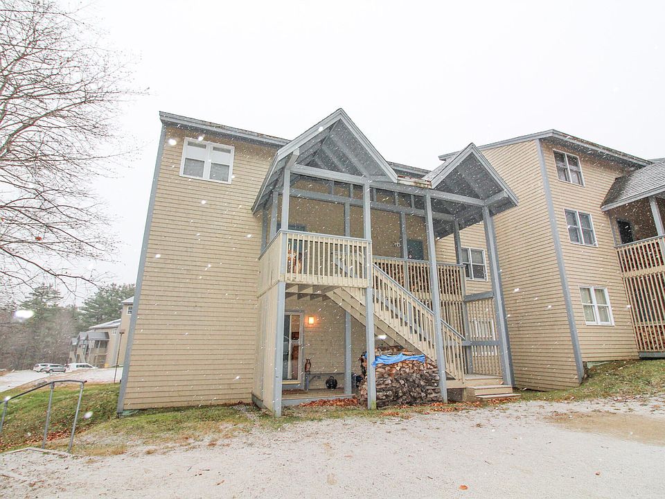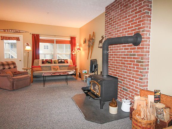 Excellent opportunity to purchase a 4 season condo at the foothills of Mt. Abram where you can enjoy a day of skiing or boarding in the winter months and impressive downhill biking trail systems in the Spring/Summer/Fall. This is an end unit that offers direct parking in front of the entry, a private porch, wood storage, use of a storage closet, and living on one level. As you enter the condo you are greeted with a decent size mudroom with coat storage, a full size bedroom with bath across from it and a large open living room, kitchen and dining room inviting with a centrally located woodstove. On site in the basement of this unit you will find common washer and dryers available for owner use. There is high ceilings in this unit and the property will come furnished and turn key ready for your enjoyment upon closing.