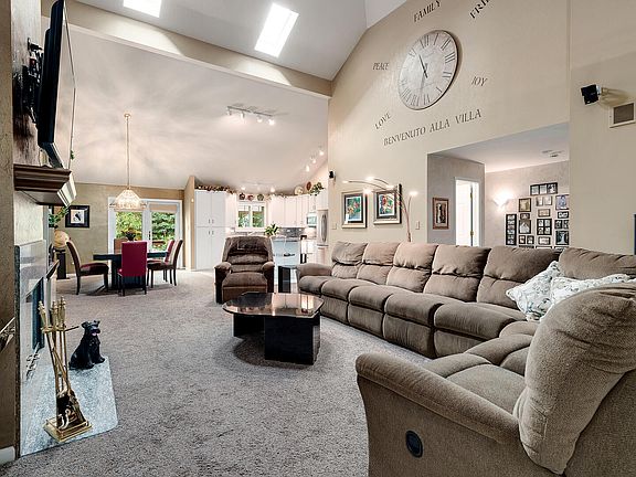 Highly desired updated end unit brick ranch with 2 bedrooms, 3 baths next to the pond. Impressive open layout with 17 ft vaulted ceilings, rich textured paint and plantation shutters. This original owner townhouse exudes style and warmth. Welcoming foyer with granite tile and coat closet. Great room with fireplace and dining room with skylights and soaring ceiling are ideal for entertaining and lead to an extended deck overlooking the pond and beautiful trees. Gourmet kitchen with white cabinets, granite counters, island with breakfast bar, stainless appliances including a Bosch dishwasher and reverse osmosis system. Master bedroom suite has a gorgeous custom made built-in, 2 closets, bath with double sinks, whirlpool tub and walk-in steam shower with bench. Pretty second bedroom, another full bath with walk-in shower and laundry with full sized washer, dryer and sink complete the main level. Partially finished basement with family room, recreation room, full bath, area that could be used as an office, utility room and lots of storage. New Andersen windows, skylights with remote shades, french doors with pleated shades, roof (2017). Hot water tank (2019) furnace and central air (2013), 200 amp electric, garage with epoxy flooring. Newer brick retaining wall, whole new driveway and concrete service walk (2016). Peace and tranquility abound in this lovely townhouse with high-end updates throughout.