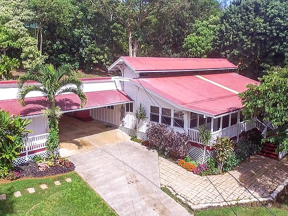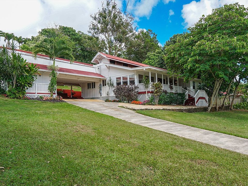 Very spacious, wide, plantation style home that has been lovingly maintained. Ready to move in with three bedrooms, two bathrooms, dining room and large lounge in the main section of the home. Separated across the carport is a fourth bedroom complete with a very nicely finished bathroom and separate entrance. The covered front lanai is a great place to greet your guests and enjoy the outdoors. Cool and inviting with a delightful sunset views to the west over the mountains. The huge kitchen is perfect for entertaining. Brand new Quartz counter tops, quality appliances, and a combination of wood flooring, tiled bathrooms and bedroom carpets make this an easy choice for discerning home owners.