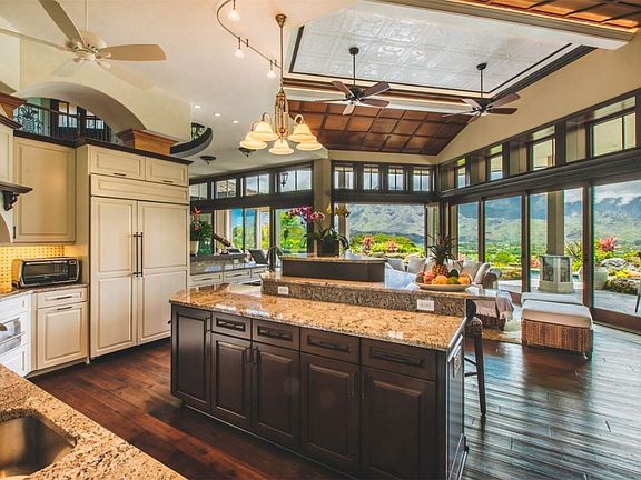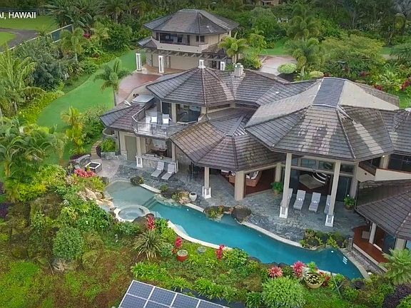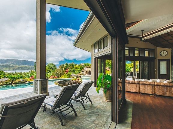 Hale Mala'e the winner of 2015 HGTV's Ultimate House Hunt - and prized as the "Favorite Backyard Retreat" Built on one of Kauai's most Idealistic locations overlooking Iconic Hanalei, showcasing unobstructed ocean and mountain views with cascading waterfalls and the occasional rainbow extending into the ocean. Views can be found from almost every room in the home. Hale Mala'e meaning house of serenity or tranquility, privacy awaits as you enter the gated access to this 1.52 acre property. Enter the home through ornately-carved large wooden doors and walk into an open atrium surrounded by water features, and a grand staircase. The Downstairs throughout the kitchen and Living room boasts large glass doors seamlessly extending the interior living space to the outdoor living area with resort style amenities, including a 50' salt water pool, waterfall grotto, and poolside kitchen, BBQ and fireplace great for entertaining guests. Downstairs hand-hewn walnut planks grace the floors of the great room and the gourmet kitchen, and the private two bedroom/two bath guest wing display Hanalei bay ocean and mountain views. Taking the sweeping staircase to the upper level, there’s an office/workout room at one end, and a private master suite at the other. The master wing has a separate laundry room, a spacious dressing room with built-in cabinetry, and an indoor/outdoor fireplace along with a hot tub on the lanai. An additional detached guest residence with a full kitchen and laundry is located over a spacious 3-car garage/storage. The homes were thoughtfully designed and materials sourced from around the world and has amenities and craftsmanship to match *Fully Furnished *High-efficiency a/c *10kw photovoltaic system *Lutron “graphic eye” lighting controls, *Sonos wireless sound system with indoor and outdoor speakers *remote-controlled electronic sun shades. * TMK Parcels 4-5-4-4-50-2 and 4-5-4-4-50-1 included w/2 dwellings.