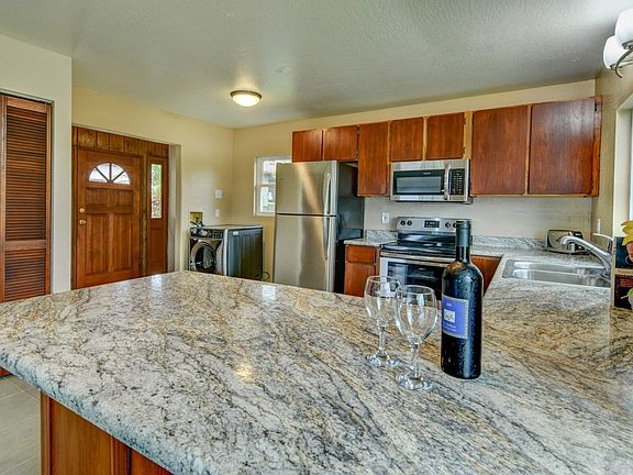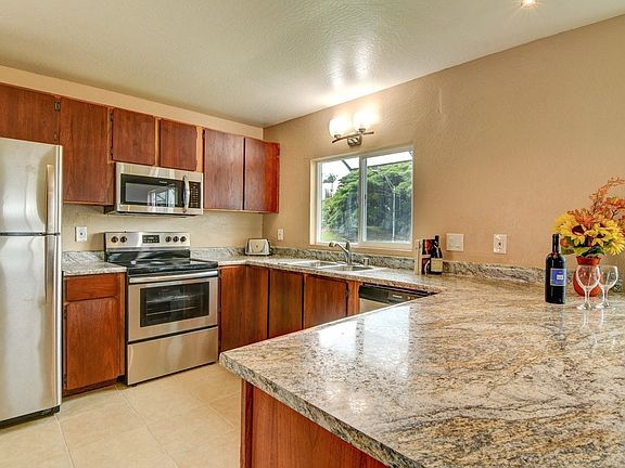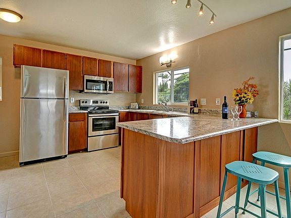 Three bedrooms and two baths with 2 outdoor deck spaces to enjoy the ocean views. Home sits up on Kumukoa hill allowing views of the bay, ocean, the airport and Hilo town. Easy walking distance to town for dining, movies, bay front and shopping. Perfect in town but enough outside to not have the hustle bustle. This home has been completely remodeled from top to bottom, including an insulated attic, and has not been lived in since the remodel. There are 3 bedrooms and 2 baths. The home is designed with family and friends in mind. The kitchen has an open concept with a sit-down breakfast bar. Brand new stainless steel appliances. Ample counter space for baking and cooking. Plenty of cabinet space for storage. A combination washer and dryer is installed in the kitchen as you first enter. There are two covered and tiled lanais on the back of the home, each with ocean views making them perfect for entertaining and outdoor dining. One of the lanais is off the master bedroom through a slider door for that morning cup of brew or your evening glass of wine. A covered walkway leads from the one car garage to the front door. It also has a sitting area for viewing the gardens on the mauka side of the home. The garage is fully finished, sheet rocked and painted. It could be made into an extra space for media or for entertaining, or playing games. A second dryer is hooked up in the garage as well. The lot is fully landscaped with a tangerine tree that has sweet fruit I am told. There are also papaya planted along the front drive. The small driveway that leads to the house is jointly owned by the houses on the street. An agreement is in place for road maintenance. Spectrum cable is available at the house! This is an ideal location for in-town living. All amenities are just minutes away.