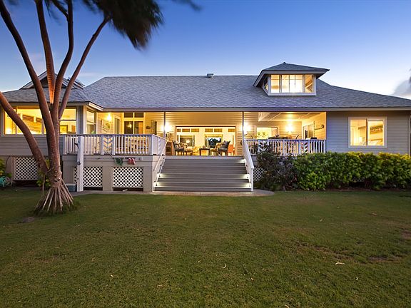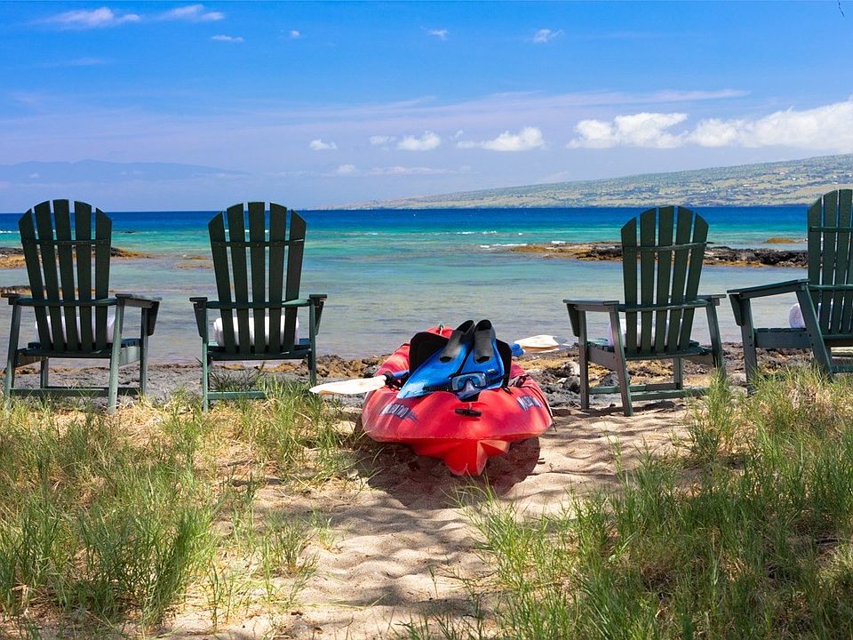 Right on the white sands of Puako! A rare opportunity to own a custom built Puako oceanfront home with access to the white sand beach directly in front of the house. A sprawling lawn with shade trees and a pathway leading you right on to the sandy beach. Spectacular panoramic views of Puako, Waialea, Kawaihae, the Kohala Mountains, Maui, and the Pacific Ocean. This home is meticulously maintained, well appointed, a much loved Kama’aina home and cottage with a very successful vacation rental history. THIS IS A LEGAL VACATION RENTAL IN RESORT ZONING. Enjoy whale watching, exploring tide pools, snorkeling, and kayaking just steps from your lanai. Located minutes from world class beaches, 5 star restaurants, and numerous golf courses. This a dream oceanfront Puako property. This beautifully furnished, well built home has 9 foot vaulted ceilings and approximately 4000 square feet of indoor-outdoor living areas. 4 bedrooms/ 3 baths total and a gourmet kitchen with top of the line appliances. The main house has 2 private bedroom suites downstairs and a bedroom with an office upstairs. There is also an office downstairs. All bedrooms have ocean views. The Ohana unit above the garage is perfectly designed for guests visiting or adds extra space for the already popular vacation rental. One bedroom ensuite with dressing area. It also has a kitchenette, full fridge and outdoor patio seating. A large lanai on the ocean side of the main house offers comfortable seating, ocean breezes, gas grill, outdoor dining and everlasting sunsets. With steps leading down to the immaculate lawn, just a hop and a skip away from the beach. It is difficult to find this level of luxury in a Puako Beach home for this price. All furnishings are included in the sale, (personal art excluded) adding a tremendous benefit to the buyer looking to keep it in the vacation rental program.