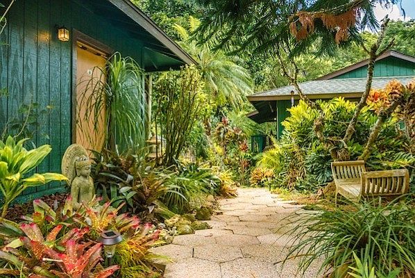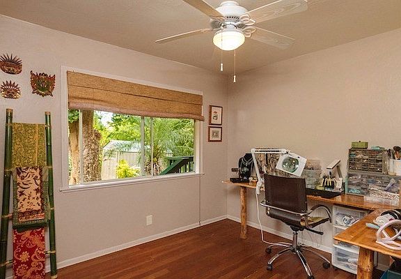 3 bedroom, 2 bath fully upgraded house situated on a lush tropical half acre in Kapahi. Interior details include solid hardwood and rock floors, newly remodeled bathrooms and an outdoor shower, brand new appliances, new exterior and interior paint, vaulted tongue and groove ceiling, on demand hot water, large fully covered lanai, and balcony off the master bedroom. There is a detached 2 car garage/gym with cabinets and a small wine cooler, 2 out buildings, a shed and under house storage. A paver walkway meanders from the cedar fence to the front door, landscaped with mature trees and exotic plants. Trees include numerous Avocados, longon, Mamee Apple, Grapefruit, lime, Bananas, Bamboo, Date palms, Cook island pine, Croton and more. The property is a private setting located on a dead end street, walking distance to a waterfall.