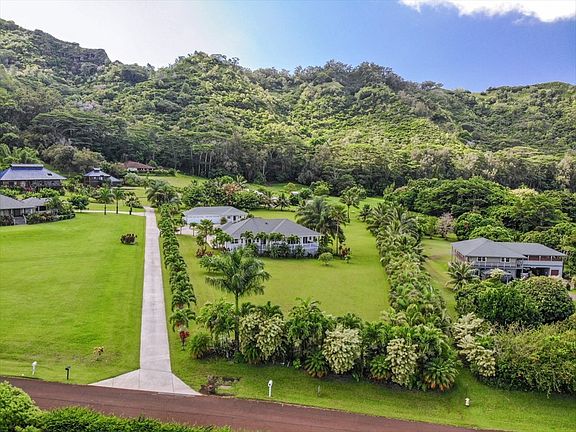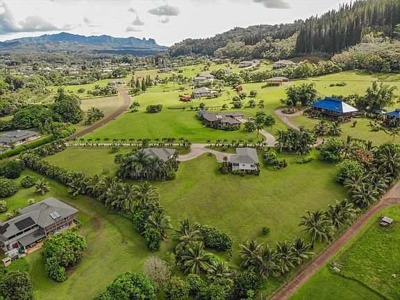 Beautiful plantation-style home located in Wailua Homesteads' prestigious Sleeping Giant Acres. Country living at its finest. This 2.39 acre property has spectacular views of Waialelale and Makaleha mountains. The main house has a large spacious kitchen, wood floors, 4 bedrooms and 2 full baths, and a large 2-car attached garage. The property also boasts an auxiliary 4-car garage structure with a bedroom, full bathroom, bonus room, and an outdoor shower. Lots of storage under both structures. Main house features include: central AC tankless Rinnai hot water heater large lanai running the length of the house high ceilings with crown moldings stainless steel kitchen appliances cherry wood cabinetry granite countertops washer and dryer plantation shutters The landscaping includes many varieties of palm trees, ti plants, and flowering tropical trees and plants. There are banana and papaya plants as well as lychee, orange, lemon, and lime trees. Lava rock hardscaping is an added feature.
