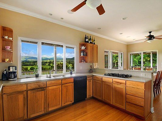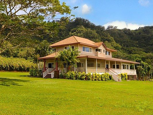 Spectacular mountain views, privacy, pastures, wrap around lanais and lawns are the highlights of this comfortable family home on over 3 acres in Sleeping Giant Acres, Wailua Homesteads. Custom features abound in the award winning design. The main living area is set up to double as a home theater and comfortable living room and is connected by French doors to a huge screened lanai with 180 degree unobstructed views of Waialeale and Makaleha mountains. Master suite features a large walk-in shower and furo tub. An office area and two more large bedrooms complete the main part of the home. Downstairs is additional living area including a family room, full bath, two bedrooms and its own lanai and yard. Plantation style, high ceilings, bamboo floors and large shade trees.