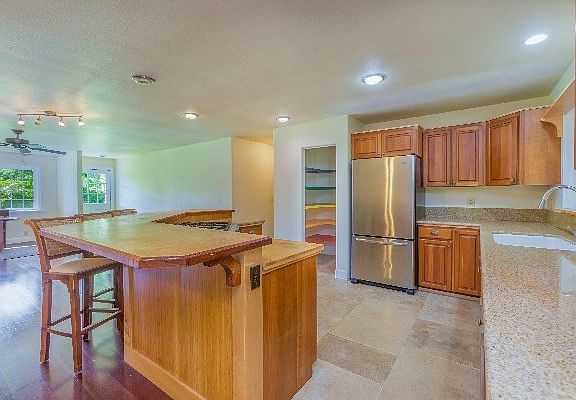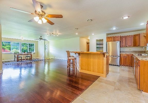 Great home in nice location in Wailua Homesteads. Three-bedrooms plus office or hobby area. Open floor plan with large kitchen, livingroom, dining area separating two bedrooms and bath on one side and master bedroom/bath/office on the other. This clean home with great floor plan invites your own touches. Travertine floors in kitchen. Gas Stove. Mahogany trim. Jacuzzi hot tup in master. Master bath features rare blue stone counter top. The nice spacious yard has a beautiful Chinese Orchid tree as well as a Poinciana and a Shower tree.