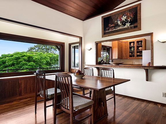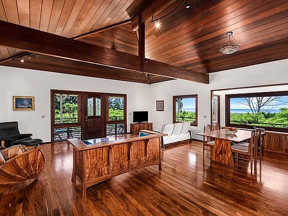 Well thought out floor plan with open living space , featuring gleaming Koa hardwood floors, vaulted Redwood ceilings & Big picture windows framing the lovely views. The kitchen offers an abundance of work space and is so very pretty, Granite counter tops, beautiful curly maple cabinets with lots of storage, new GE Café quality appliances & breakfast bar.