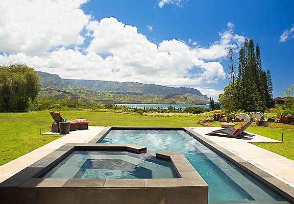 The best value for unobstructed views of Hanalei Bay & Bali Hai... This brand new 4 bedroom, 3.5 bath custom home is the perfect blend of tropical elegance and state-of-the-art functionality. Located on the bluff overlooking Hanalei Bay with incredible views of the coast, Bali Hai, a mountain panorama, and numerous waterfalls. Kick off your shoes and watch the surf from your lanai. Enjoy the daily sunset from almost every room in the house. This thoughtfully designed estate home is complemented by a saltwater swimming pool, spa, and sauna. Quality craftsmanship and attention to detail is evident throughout. Honed granite counter tops, imported merbau cabinetry, stainless steel Viking appliances, over-sized granite soaking tub, stucco exterior, no VOC paints, exotic hardwoods, 1x8 plank reclaimed teak flooring, honed basalt tiles, stainless steel railings, and solar hot water. Artfully landscaped by DesignScape. Complemented by an optional furniture/art package. Total Area Under Roof = 5,276 sqft Covered Lanais = 836 sqft Uncovered Lanais = 400 sqft Total Interior Living Area = 3,864 sqft Porte-Cochere = 576 sqft