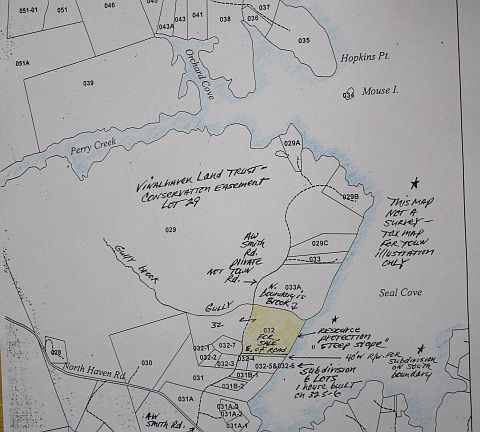 (This is a new listing and a work in progress with more information, and possible corrections, still pending.) This estimated 20+/- acres were once part of a 19th Century large farm with shore front on Seal Cove. There are many possible building sites; in an old pasture bigger than a football field, on top of a ridge next to the field overlooking Seal Cove, and another near Gully Brook on the northern part, surrounded by oaks, old growth, and new. This possible site, and the most interesting, will need a driveway in, and the length depending on how close to the shore it is. Even then it will not have a panoramic open view of the cove because of the setback, and trees. A septic design was completed, for a 3 bedroom home about 150 feet from gully Brook, and 120 feet from A. W. smith Rd. The parcel is being sold with no survey, but the western boundary is A.W. Smith Road, the eastern boundary Seal cove, the northern boundary Gully Brook, and the southern boundary a surveyed line of a neighbor. The deeded tidal shore frontage is 695 feet, and is zoned (Resource Protection) because of "steep slope.," A.W. Smith Rd. is private, a very good gravel/dirt road, a dead end, and is off the North Haven Road. There is one homesteader on A. W. Smith Road, while the other homes are used just in the summer months. On the shore, a pulley line is possible for access to deeper water out in the cove. Being farmland at one time, stone walls are seen here and there, but what makes this property unique is the football sized open grassy field, which could be even bigger with the cutting of some encroaching young spruces, and brush. There is a driveway through an old opening in a stone wall to this field. The buyer can become the custodian of the many old growth oak trees, as well as their young offspring, which are rare in such numbers on the island. When Gully brook is running fast over the high rocks at this northern boundary, and shorefront, the sound is deafening. One can walk there and sit, and would be better with some tree limbing. A camper trailer is for sale on the edge of the field if a buyer is interested.