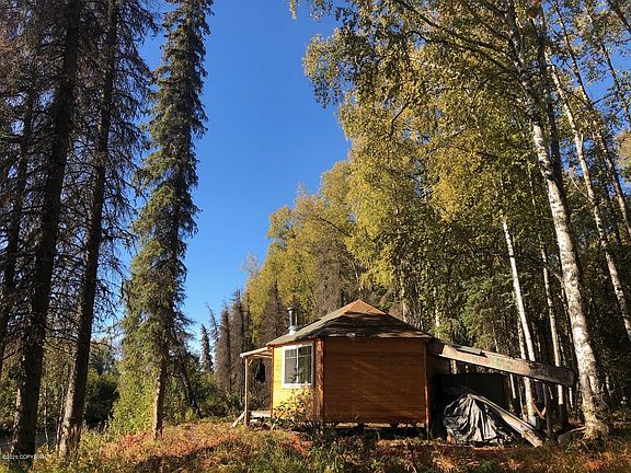 Resting on the bank of Little Willow Creek sits a cute dry cabin/cottage ready to go for new owners to enjoy. Accessed by ATV, Snowmachine, or Walking down the trail from Parks Highway ( see confidential remarks ). Small solar charger and battery to run lights, filter drinking water set-up, Wood stove, saw dust toilet and camp shower, shed with generator. Fish from your deck! This is a good one