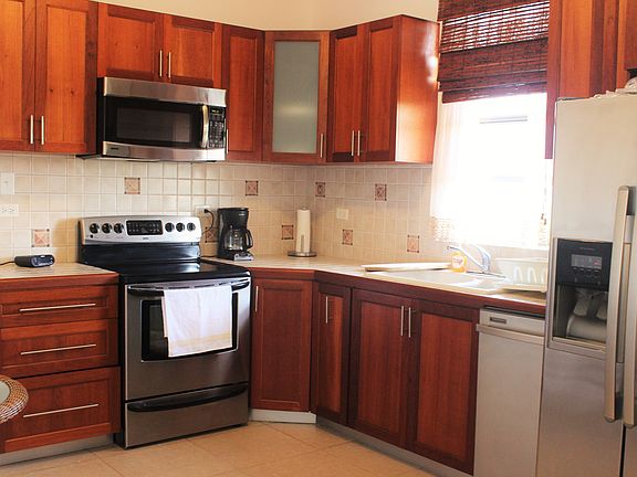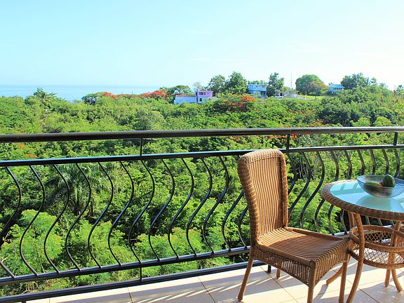 Description Poinciana is a condominium located on Road 413 which is known as the Road to Happiness. This unit has a spectacular ocean and mountain view. The beach is just a 3 minute drive away and the lighthouse area too. Unit has two bedrooms and two bathrooms, one in the master bedroom with a shower and the other in the hall with a bathtub.There is a sofa bed in the living room and you can fill the breeze through out the unit. Full kitchen is equipped with dishwasher, stainless steel appliances and also has an ocean view. There are ceiling fans throughout the unit and the balcony provides a great space to relax and to have outdoor dinners. Right across the street there is a bakery, a coffee shop and 3 restaurants walking distance. This property has 2 Queen(s), 1 Pull Out Sofa(s).