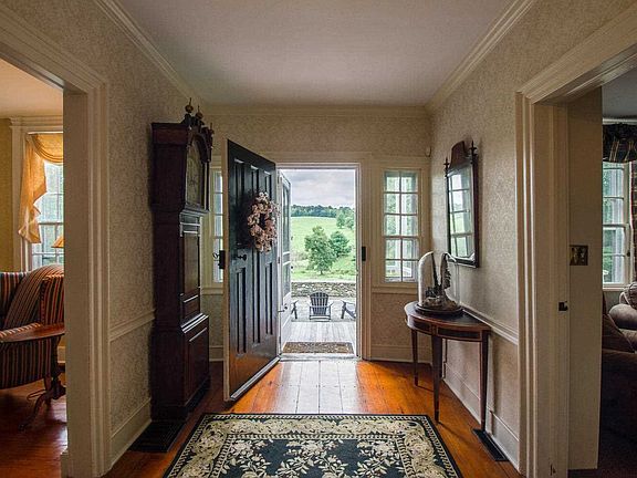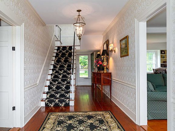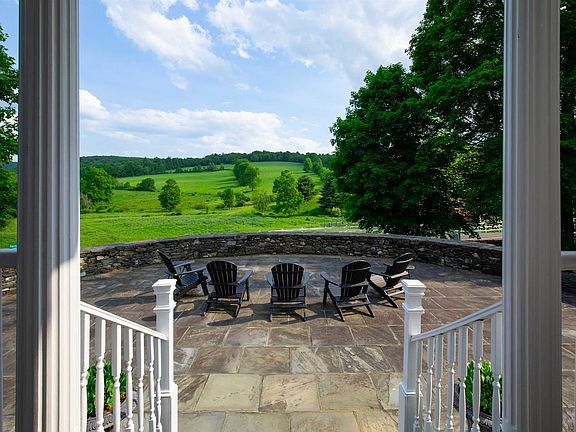 Handsome and stately, this 1810 Georgian Colonial-style farmhouse overlooks a breathtaking rolling countryside, unspoiled for 200+ years. A striking half moon-shaped stone wall rises up to the front patio, creating a private paradise on a bucolic country road with some of the most compelling farmland views in the Hudson Valley. A true front-to-back center hall, the home is elegant and gracious, with a grand entrance, hand-hewn beams, beautiful original details, formal dining room, front parlor, library, and 7 fireplaces. The new kitchen addition, with Wolf and SubZero appliances, is country-sleek, with a charming informal dining area, a mudroom, and a 4-season entertaining porch. Upstairs, there's a luxurious master bedroom with a newly renovated ensuite bath, 3 additional guest rooms, a full bath, and a finished third floor bonus room. The gorgeous 30-acre landscape surrounding the house features an inground pool, pool house, stone fireplace patio area, chicken coop, formal garden, pond, and a charming 2+ bay garage. CO-EXCLUSIVE